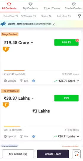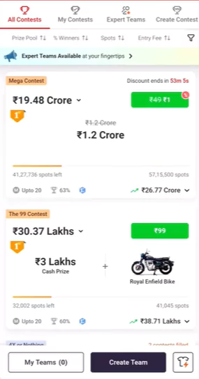 You can create up to 20 different teams for each match and join lots of contests. Since it’s your first time, you’ll find a mega contest for just ₹1. Tap on it to join.