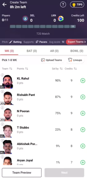 Now, let’s build your team! Open today’s match, for example, Delhi vs. Lucknow. Click on “Create Team.” You’ll see all the players split into groups: wicketkeepers, batsmen, all-rounders, and bowlers.
