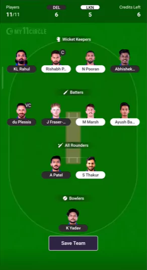 Pick 11 players total from both teams. I usually choose players who score lots of runs or take wickets. Let’s say I pick KL Rahul, Rishabh Pant, N. Pooran, and Abishek Porel as wicketkeepers. For batsmen, I’ll choose Faf du Plessis, J. Fraser, M. Mar, and Ayush Badoni. In all-rounders, Aneesh Patel and Sardar Thakur seem good. Finally, for bowlers, I’ll pick Kuldeep Yadav.