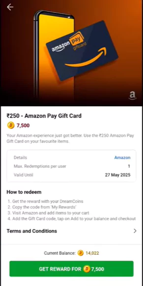 Scroll to the Dream Coins part in the app. You might see different vouchers, such as a ₹250 Amazon Pay gift card. - Redeem Your Coins: